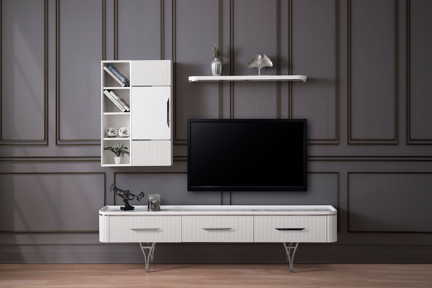 - Alina Tv Ünitesi, alt, üst ve raf modülden oluşmaktadır.