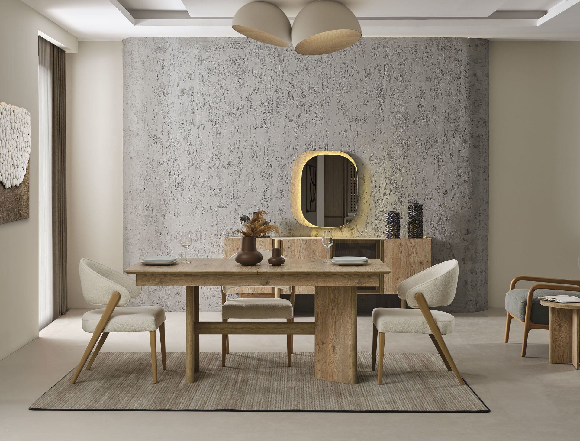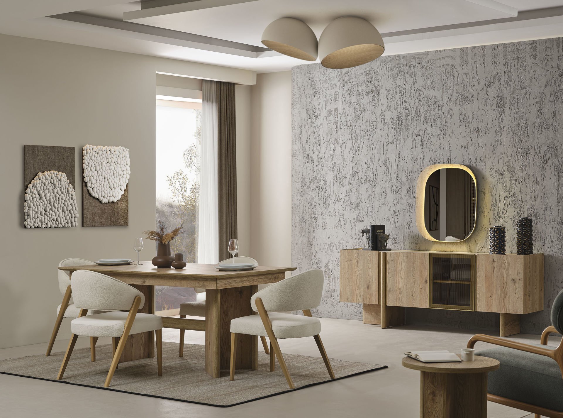 - Anka yemek odası içeriği: 1 Adet Konsol+aynası, 1 Adet Masa, 6 Adet Sandalye den oluşmaktadır.