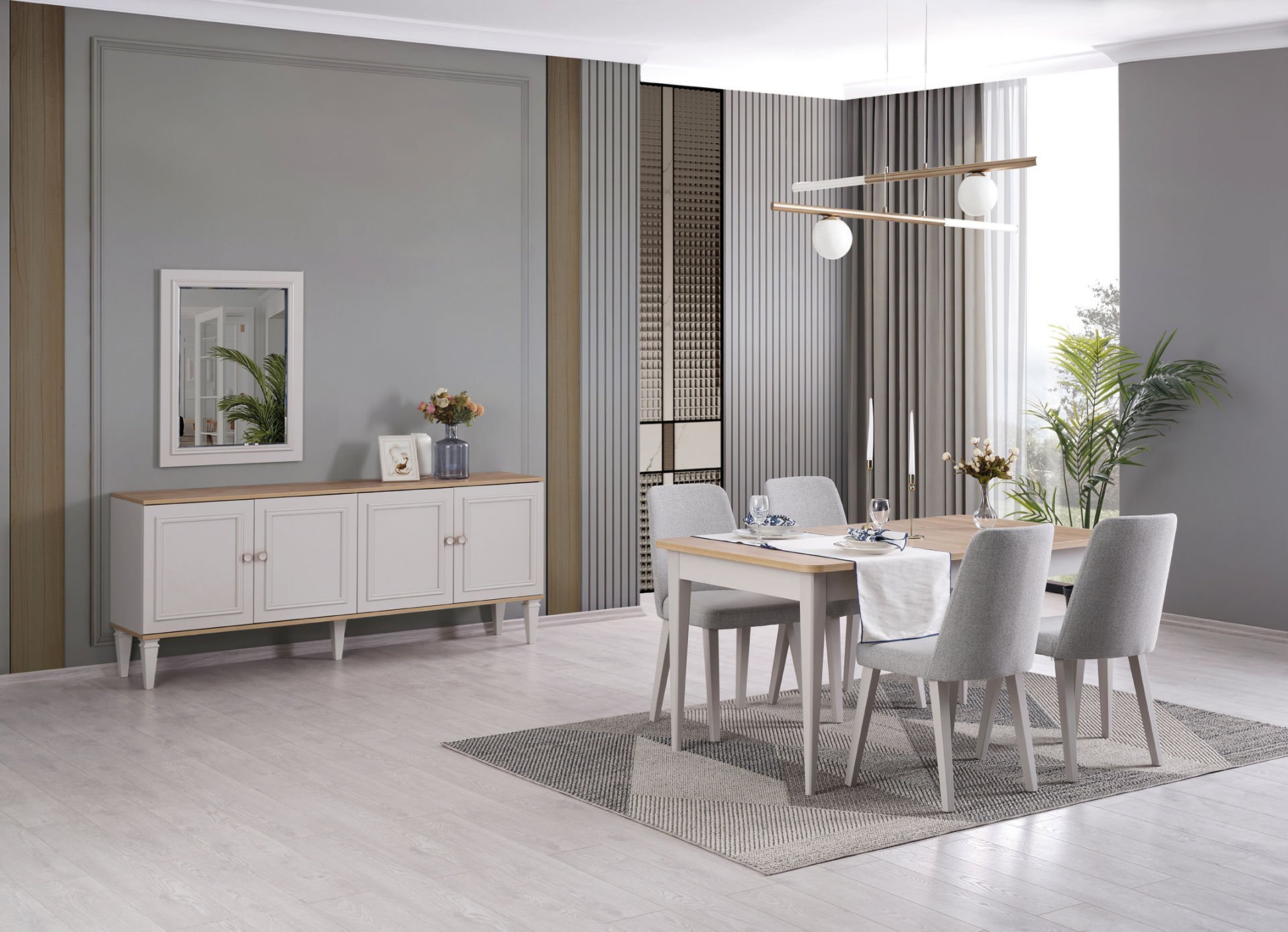 - Batu yemek odası içeriği: 1 Adet Konsol ve aynası,1 Adet Açılır Masa, 4 Adet stock sandalye den oluşmaktadır.