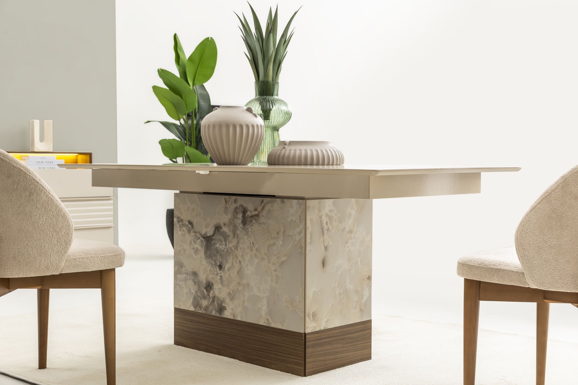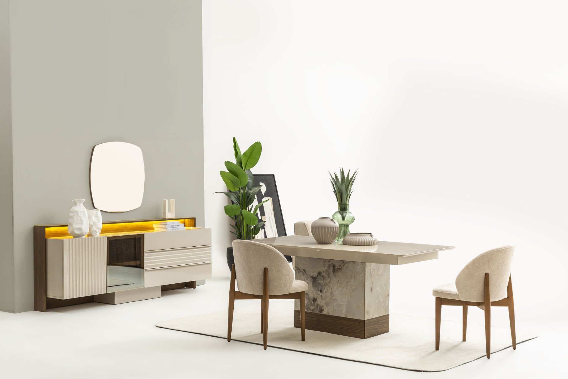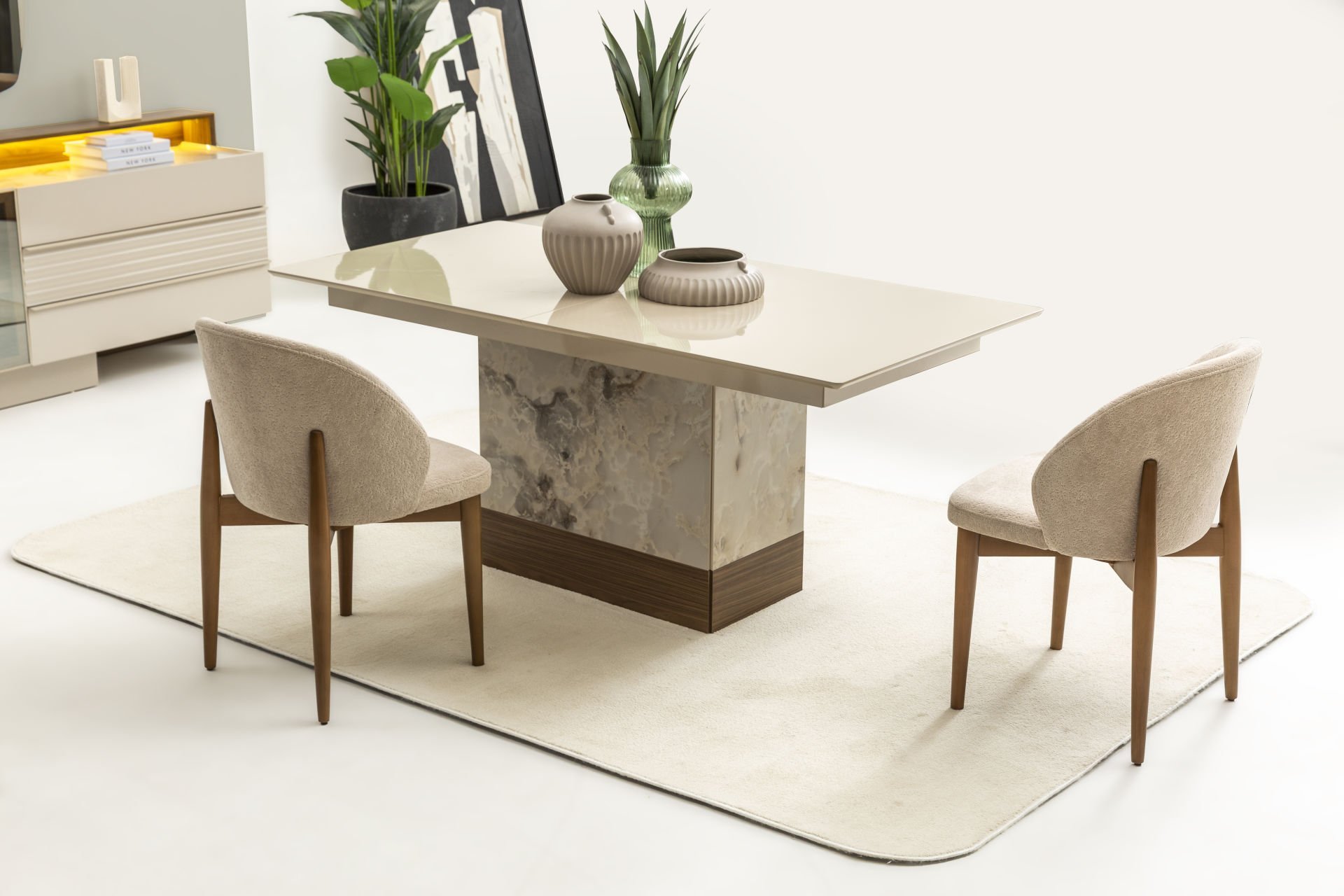 - Cosmo yemek odası içeriği: 1 Adet Konsol+aynası, 1 Adet Masa, 6 Adet Sandalye'den oluşmaktadır.