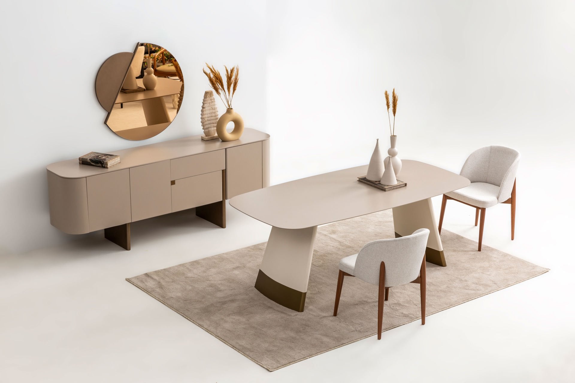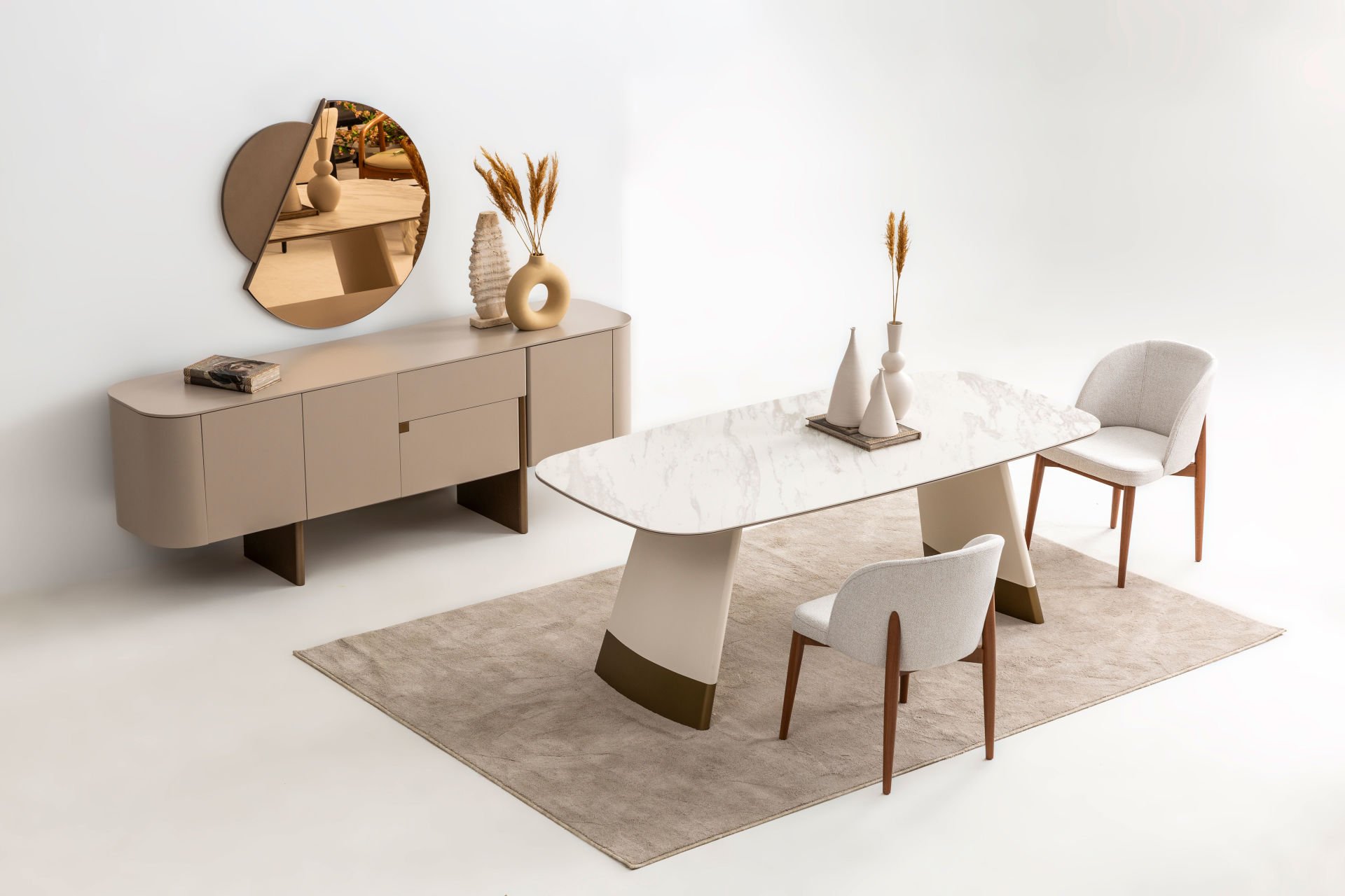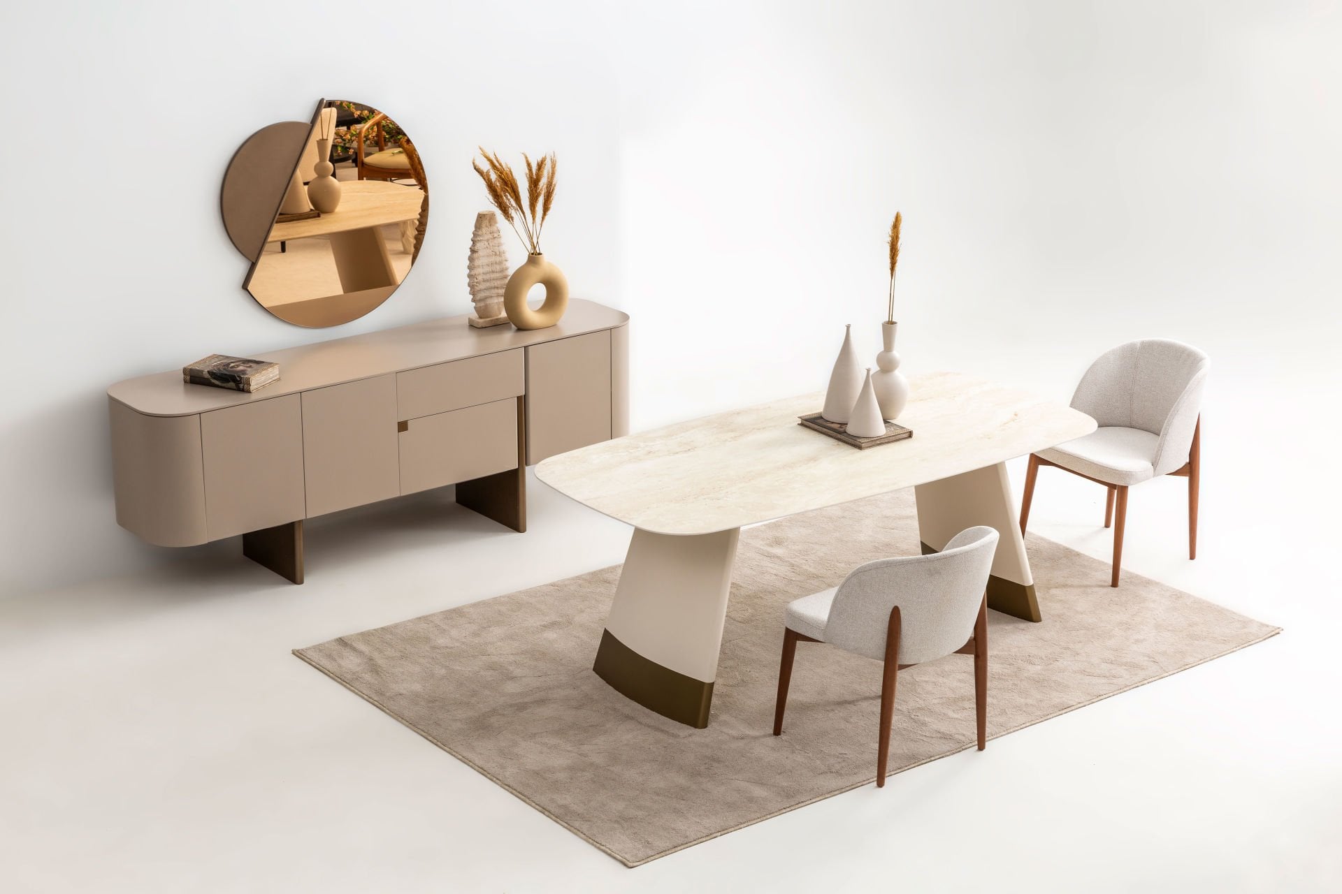 - Delta bej yemek odası içeriği: 1 adet konsol+aynası, 1 adet standart masa, 6 adet kumaş döşemeli side sandalye den oluşmaktadır.
