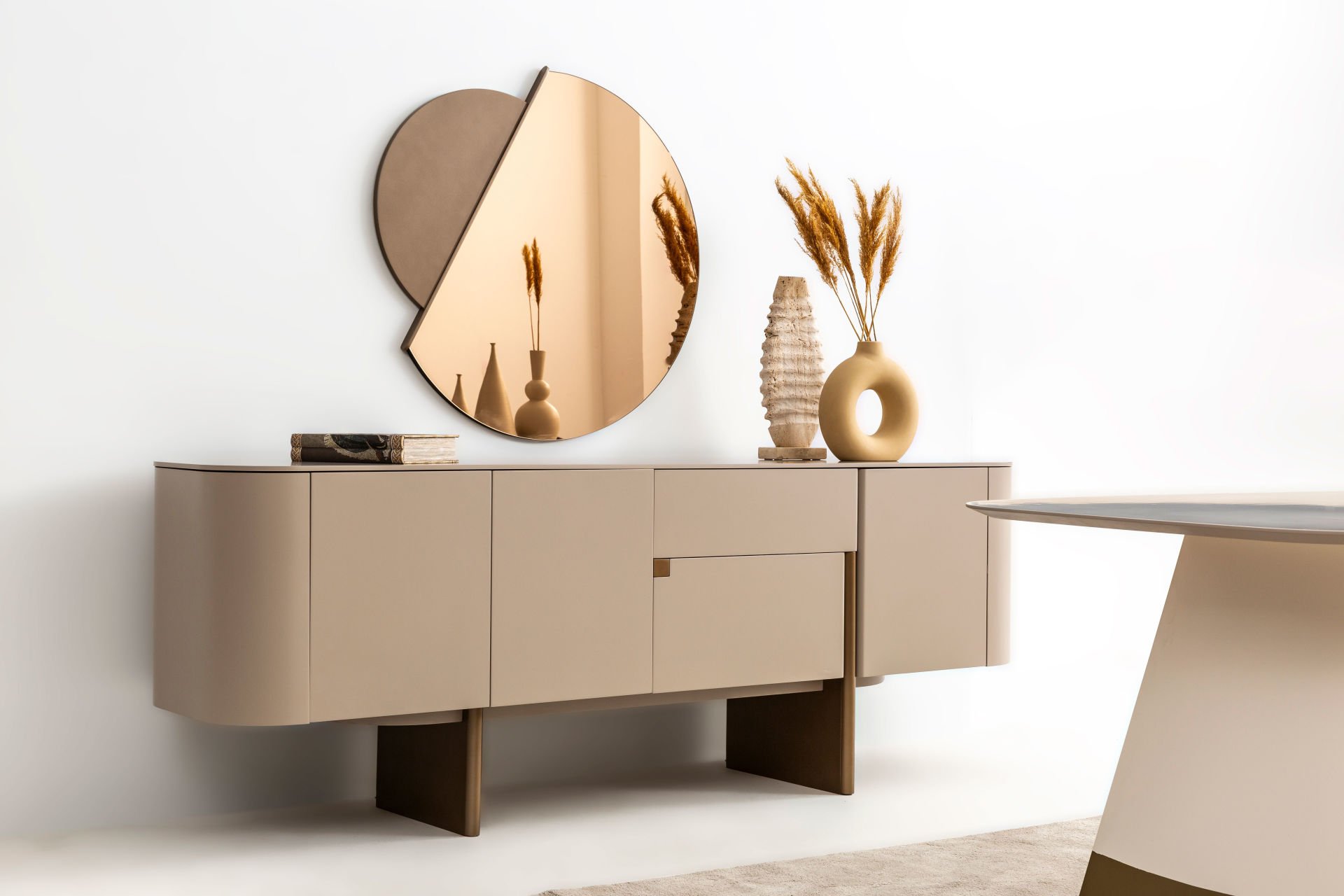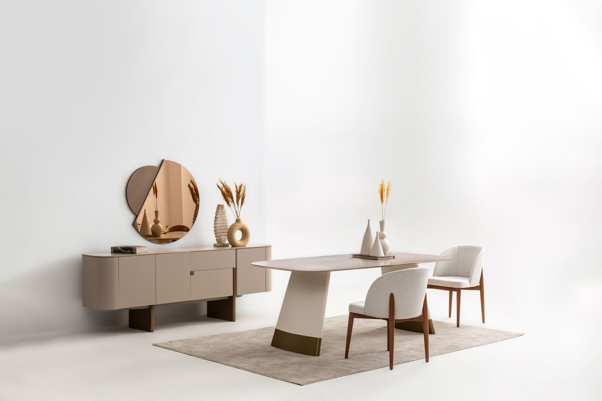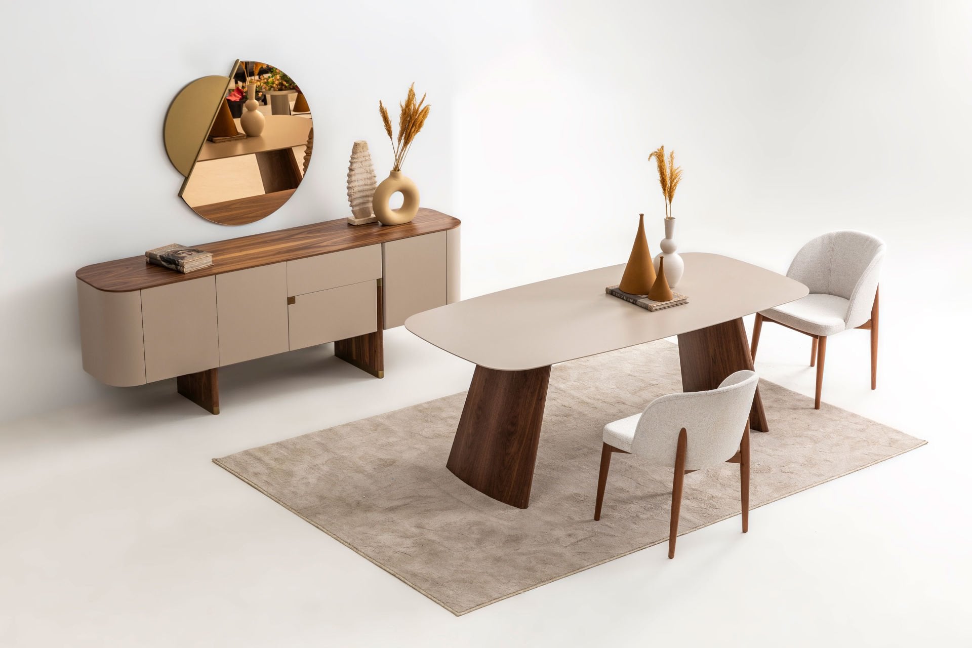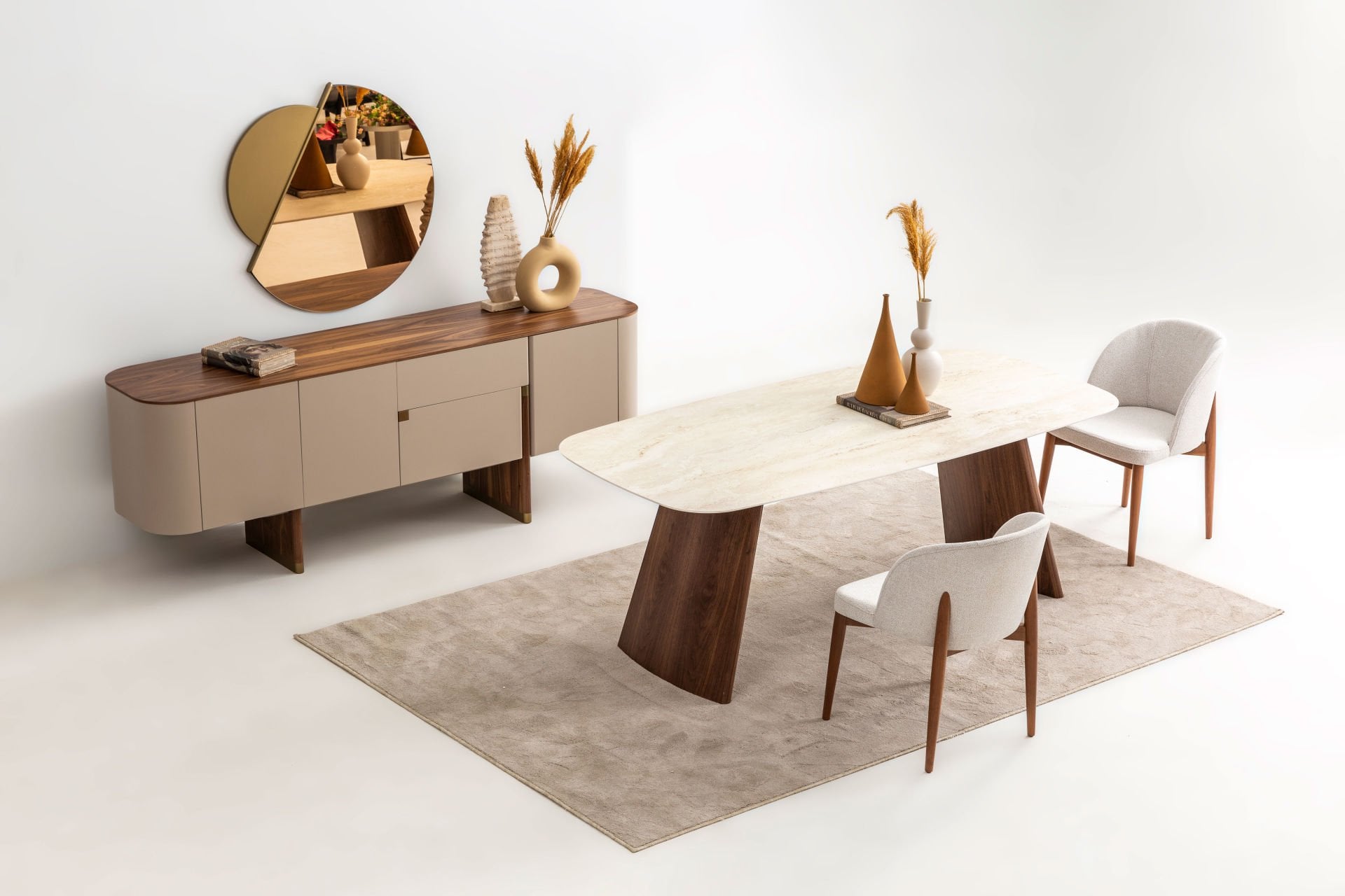 - Delta bej yemek odası içeriği: 1 adet konsol+aynası, 1 adet standart masa, 6 adet kumaş döşemeli side sandalye den oluşmaktadır.