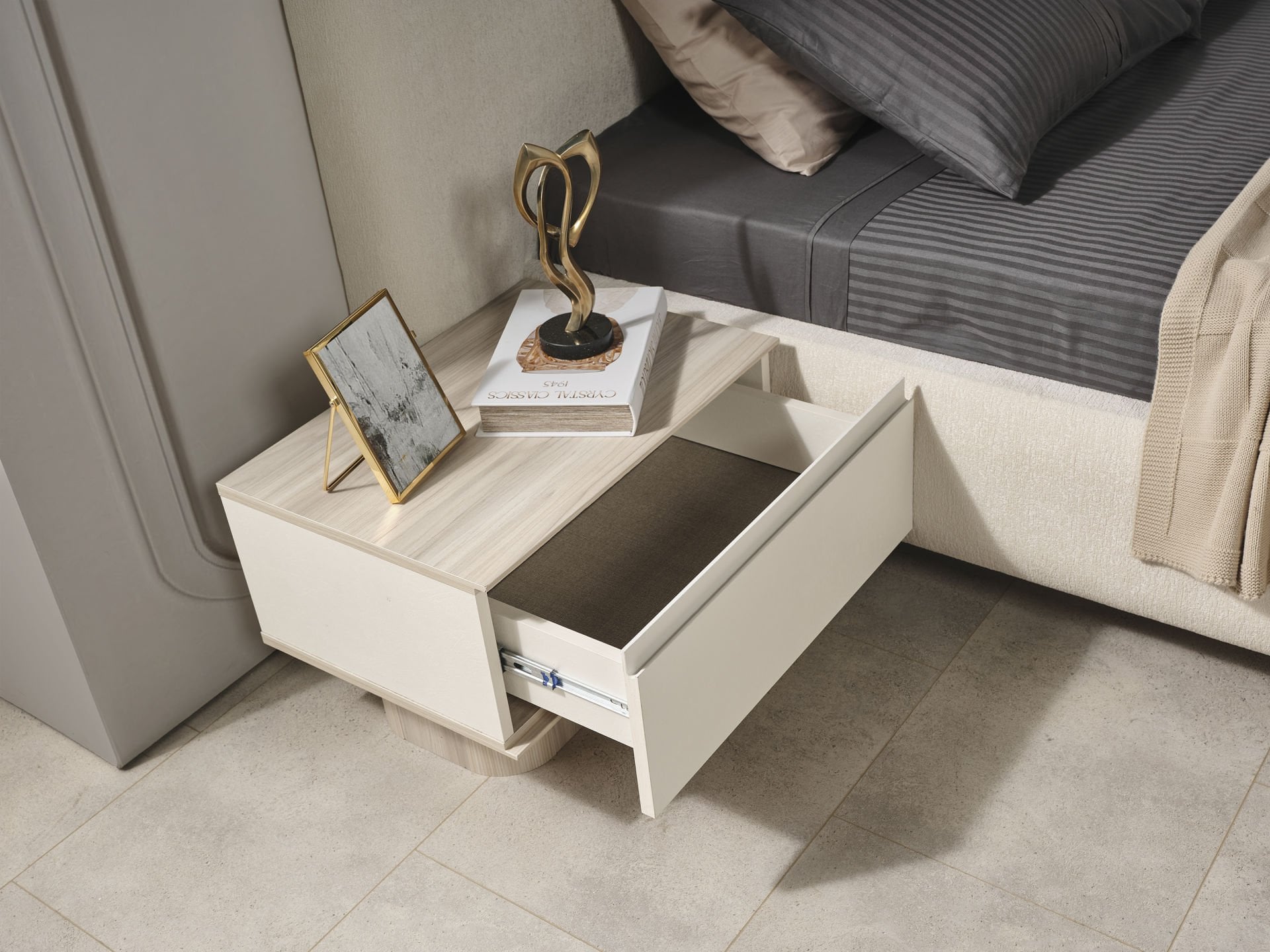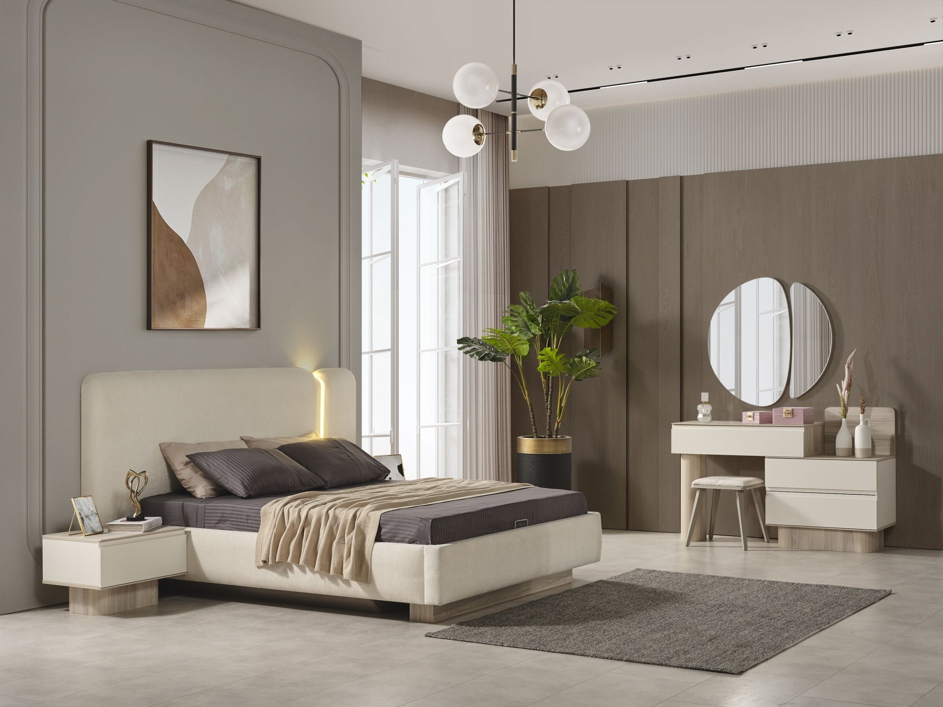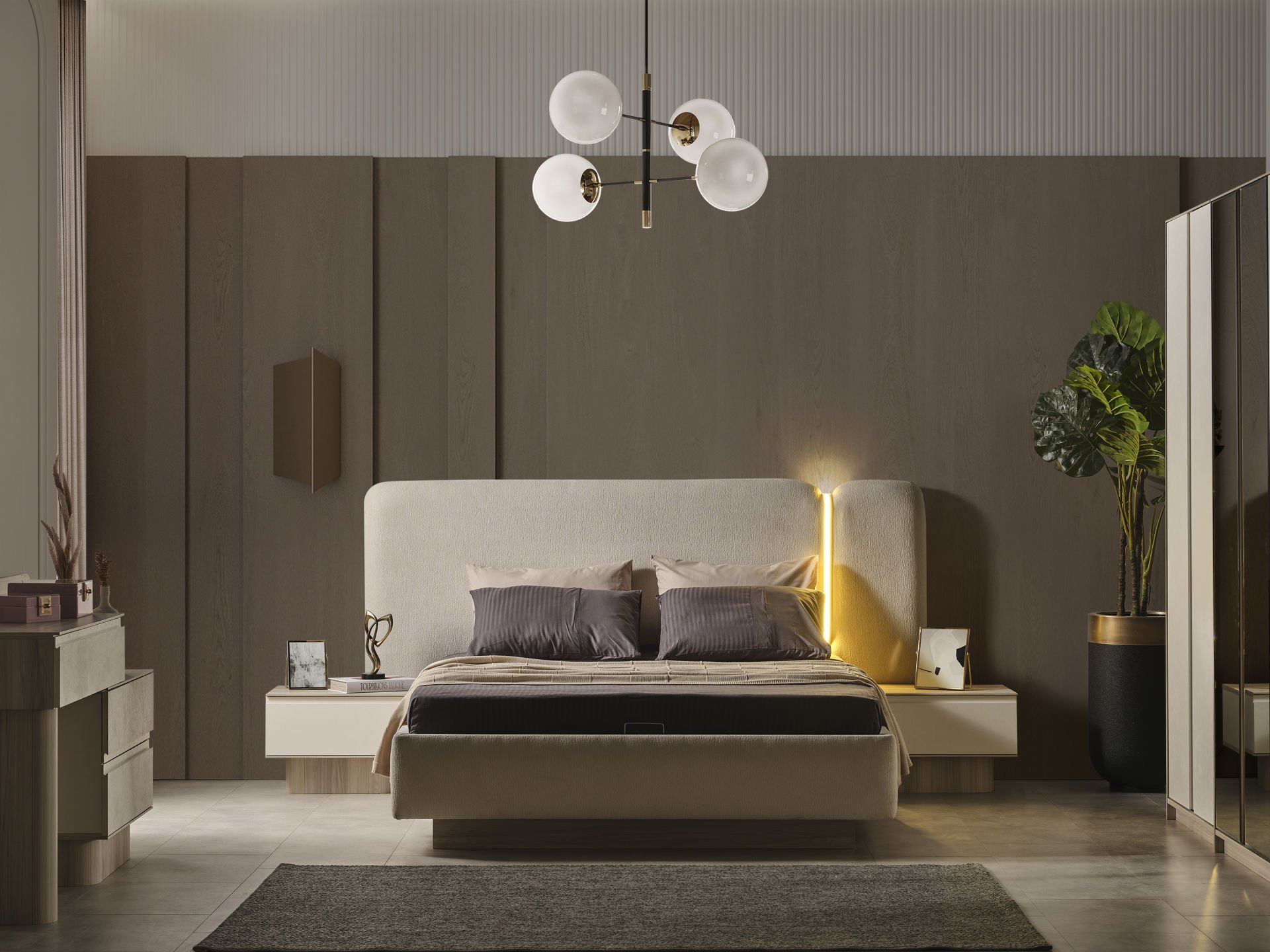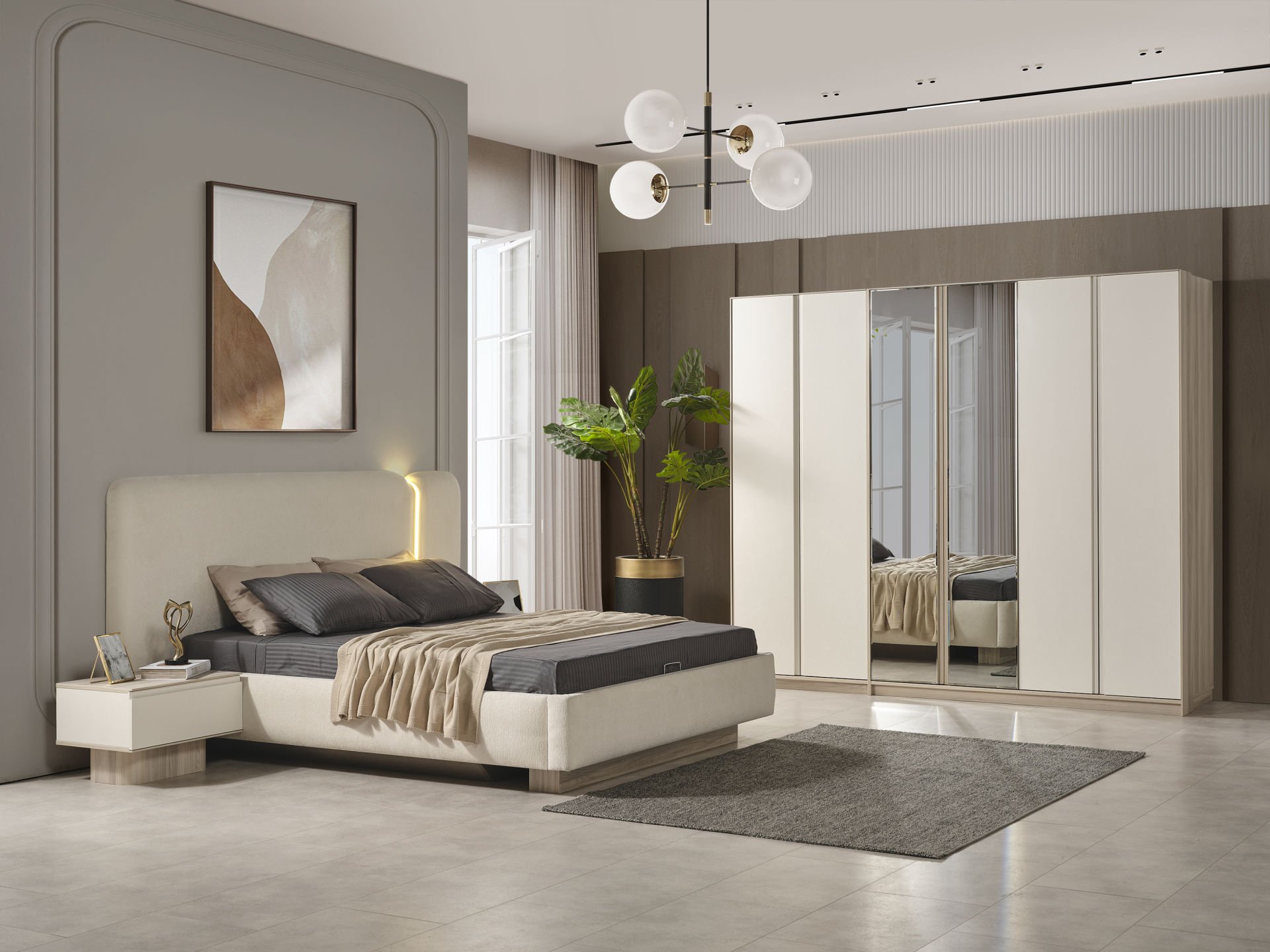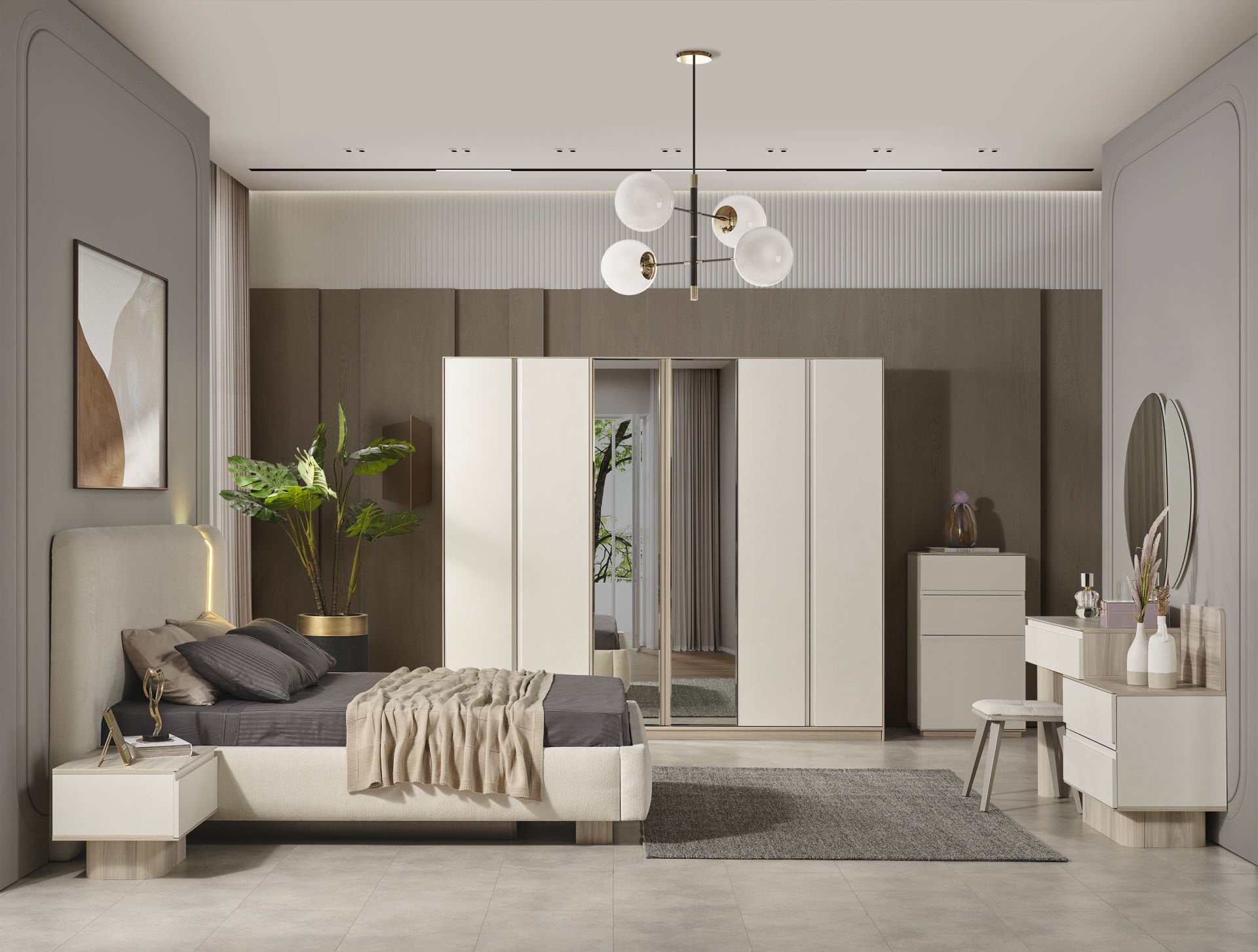 - Güneş Yatak Odası Takımı, dolap, şifonyer + ayna, bazasız karyola başlık ve 2 adet komodin'den oluşmaktadır.