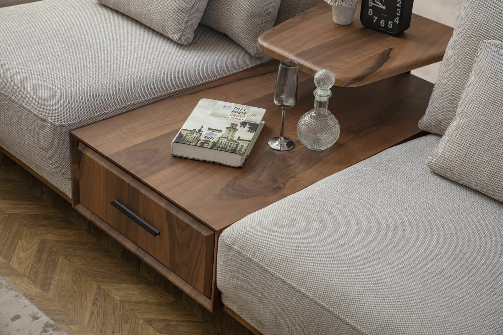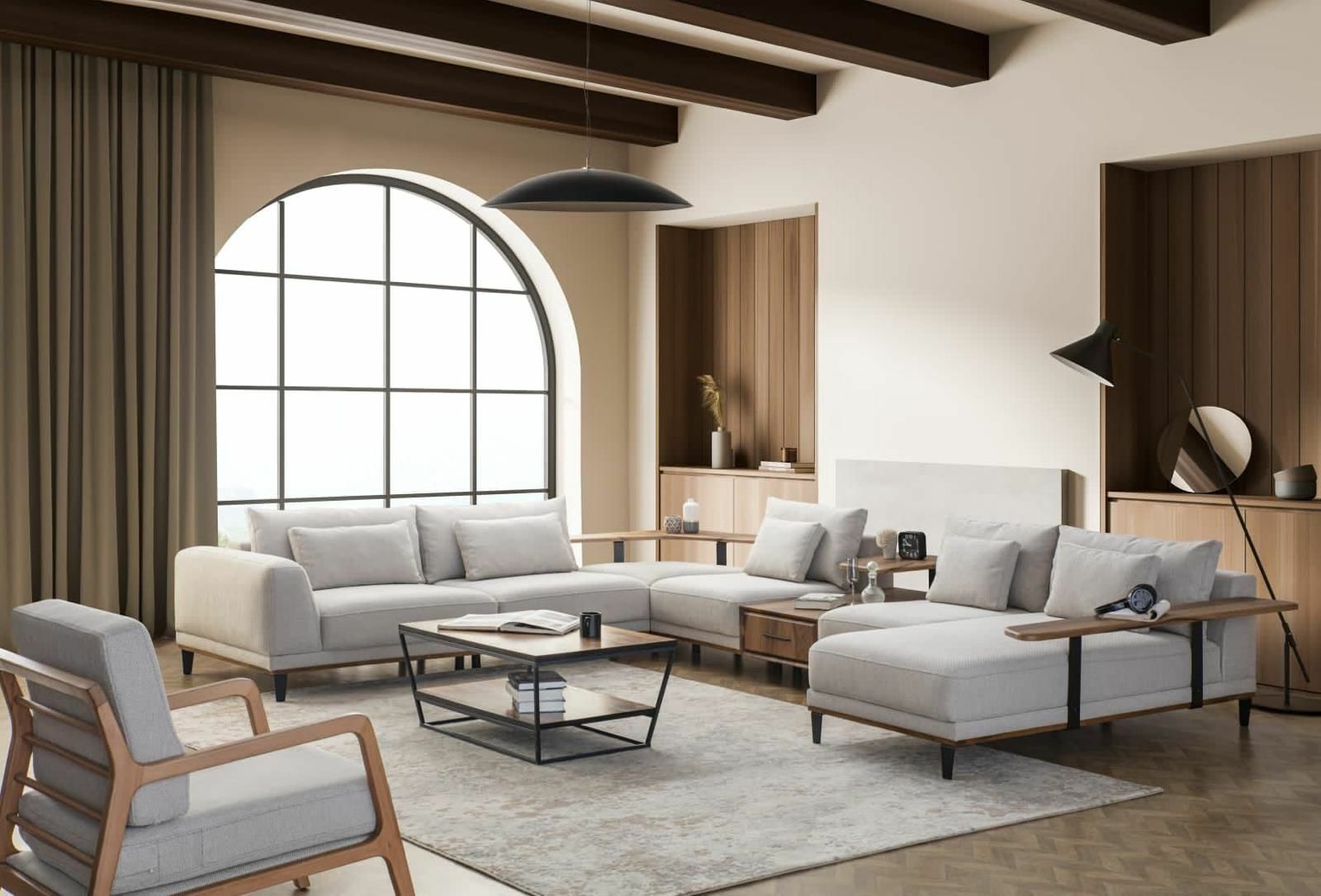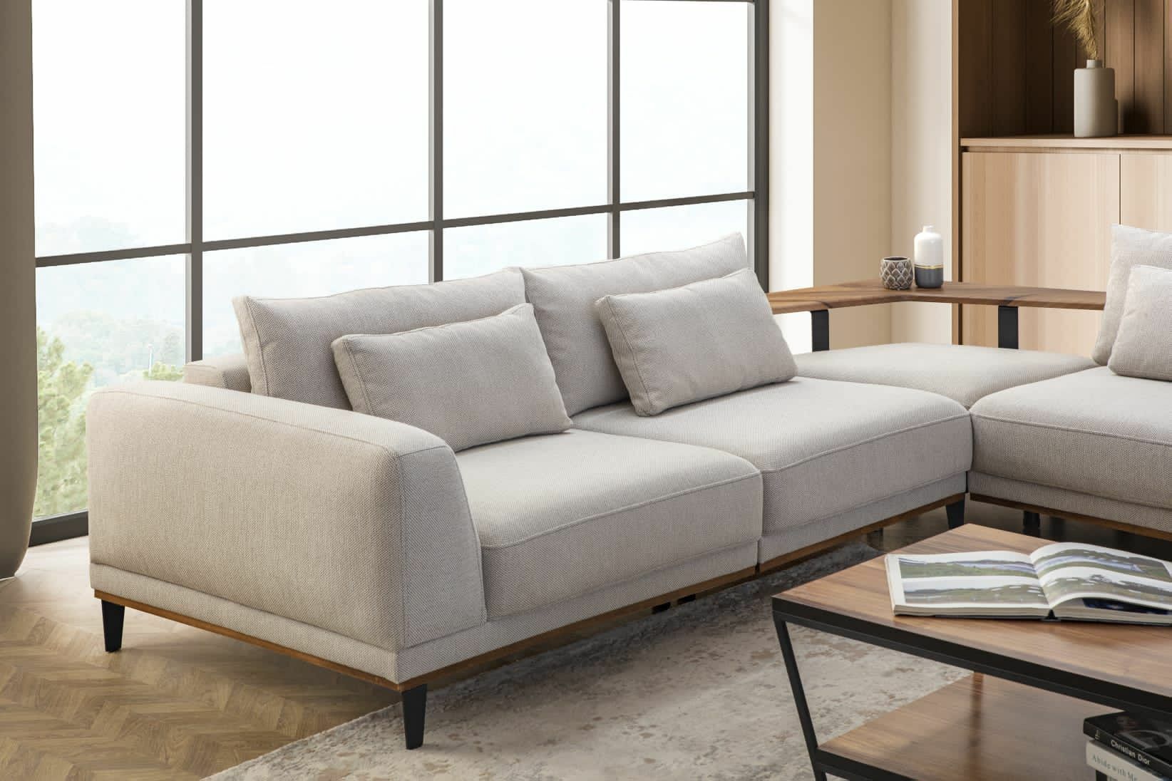 - Konfor köşe takımı 2 adet kollu modül, 1 adet 95 lik kolsuz modül, 2 adet 75 lik kolsuz modül, 1adet ahşap sırtlı köşe modül, 1 adet sehpa modülünden oluşmaktadır.