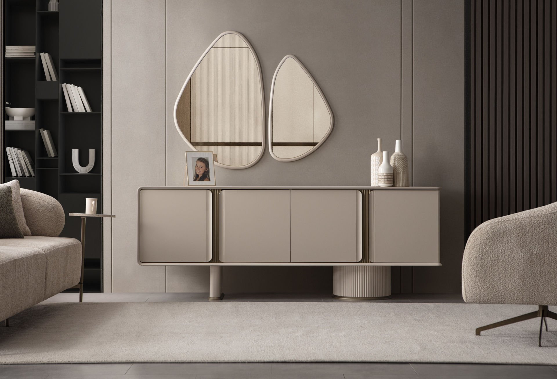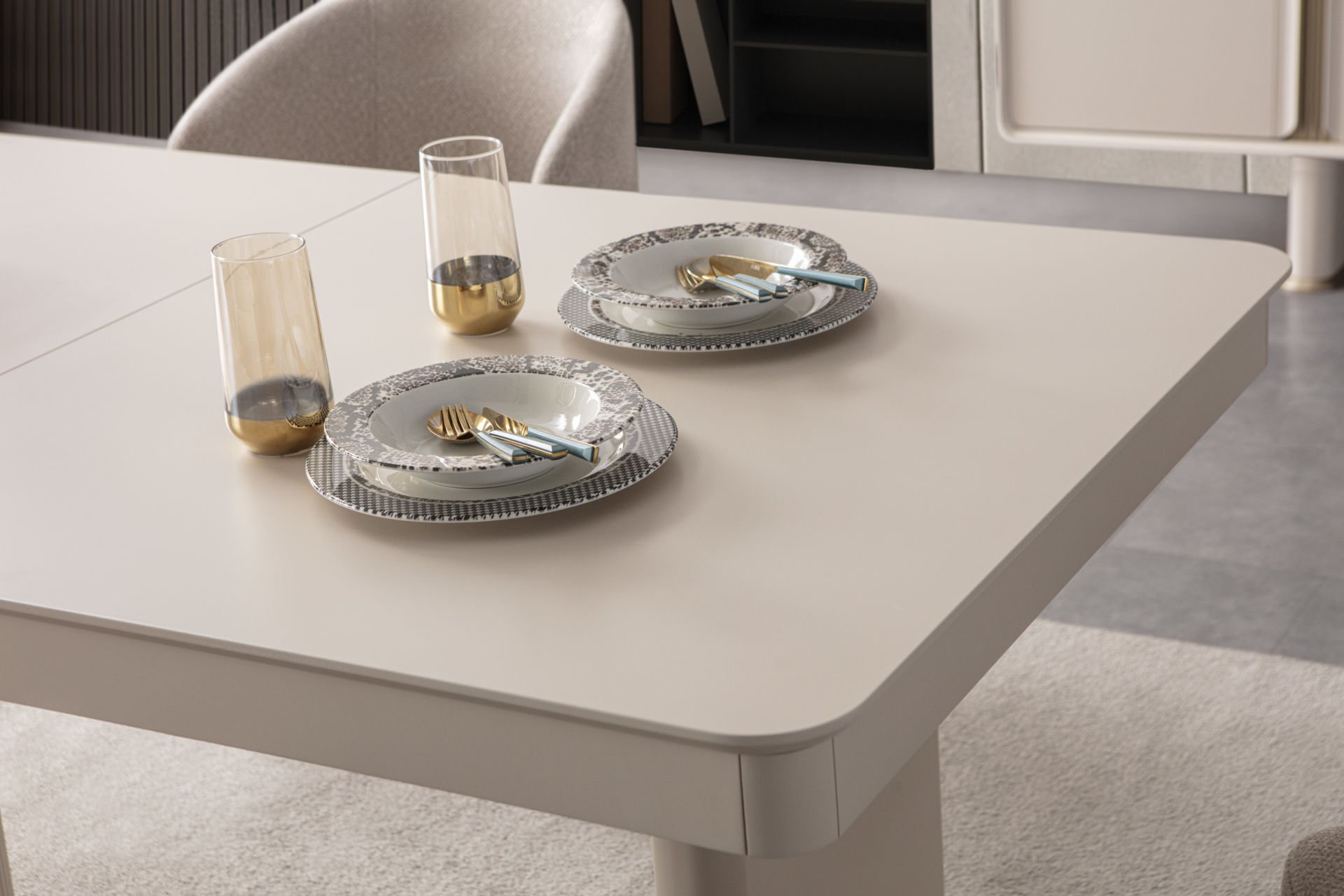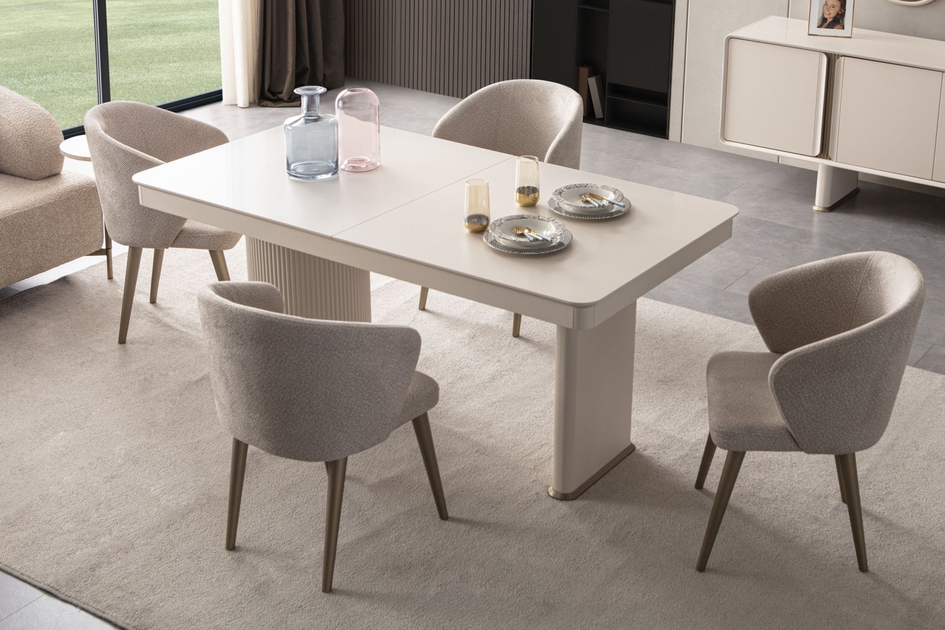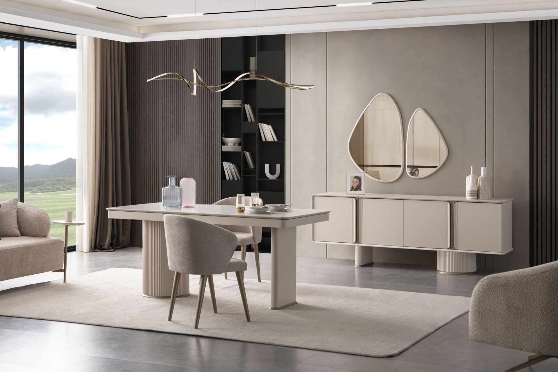 - Kumsal yemek odası içeriği: 1 Adet Konsol+aynası, 1 Adet Masa, 6 Adet Sandalye den oluşmaktadır.