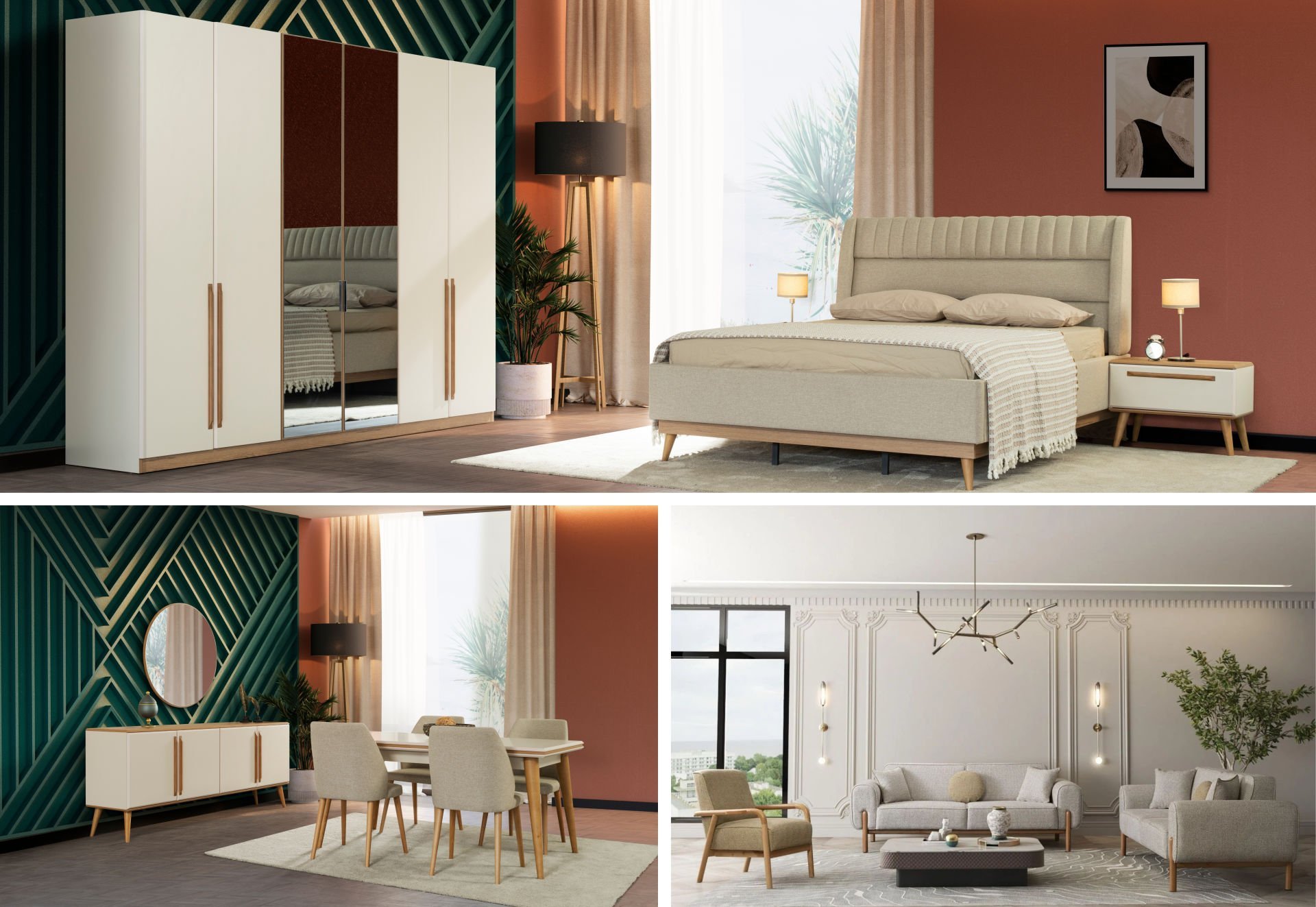 - Liza Yatak Odası, 1 Adet 6 Kapılı Dolap, 2 adet komodin, 1 adet bazasız karyola, başlık, 1 adet Şifonyer ve aynasından oluşmaktadır.