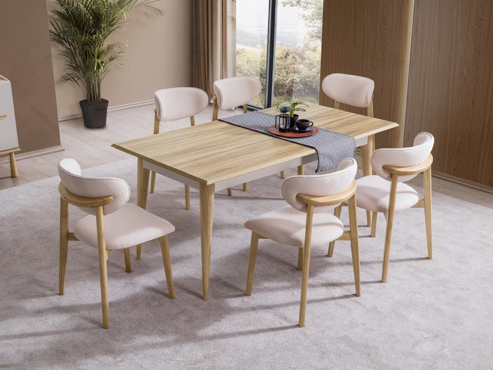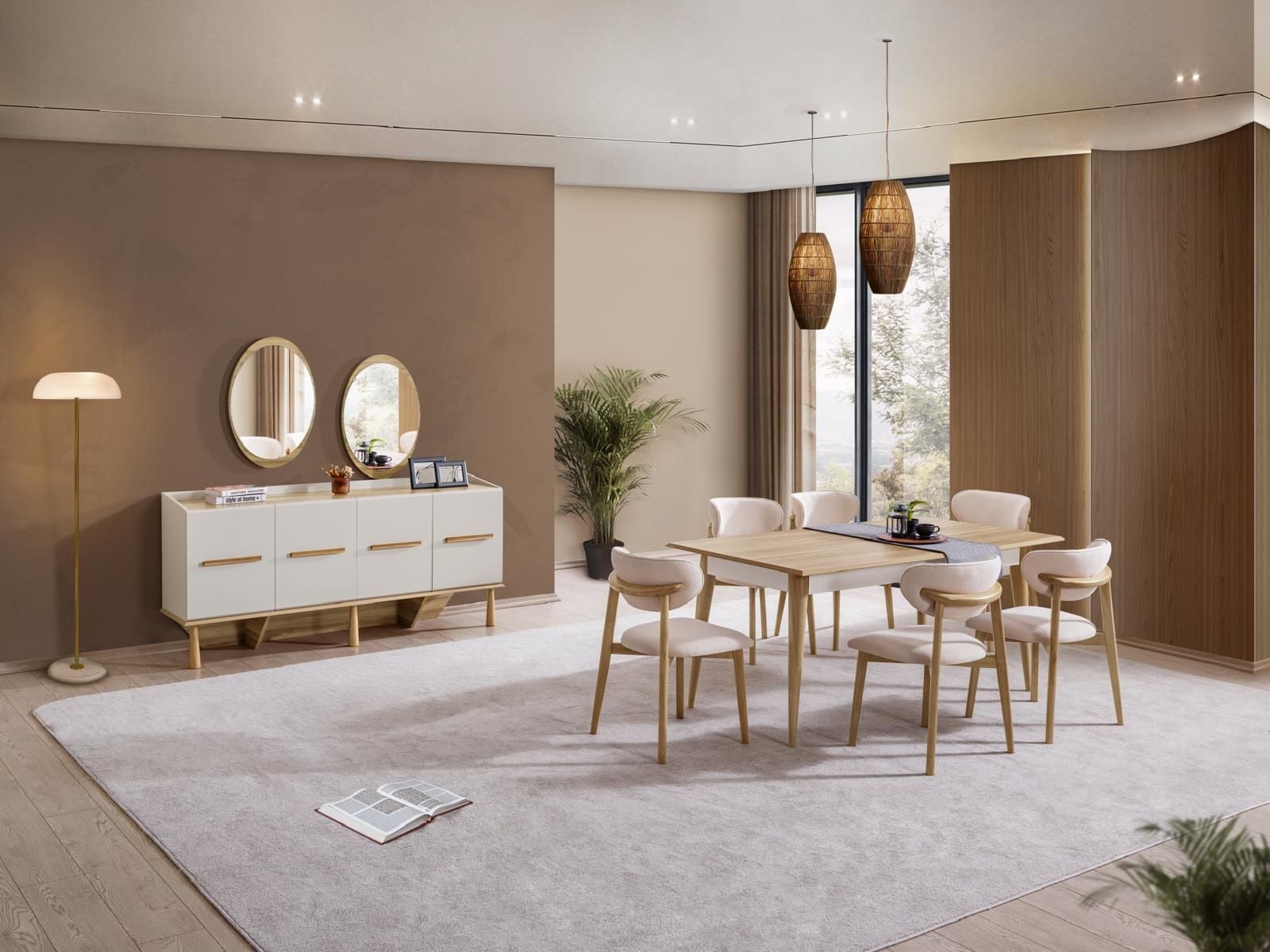- Moon yemek odası içeriği: 1 Adet Konsol ve aynası, 1 Adet Masa, 6 Adet polo sandalye den oluşmaktadır.
