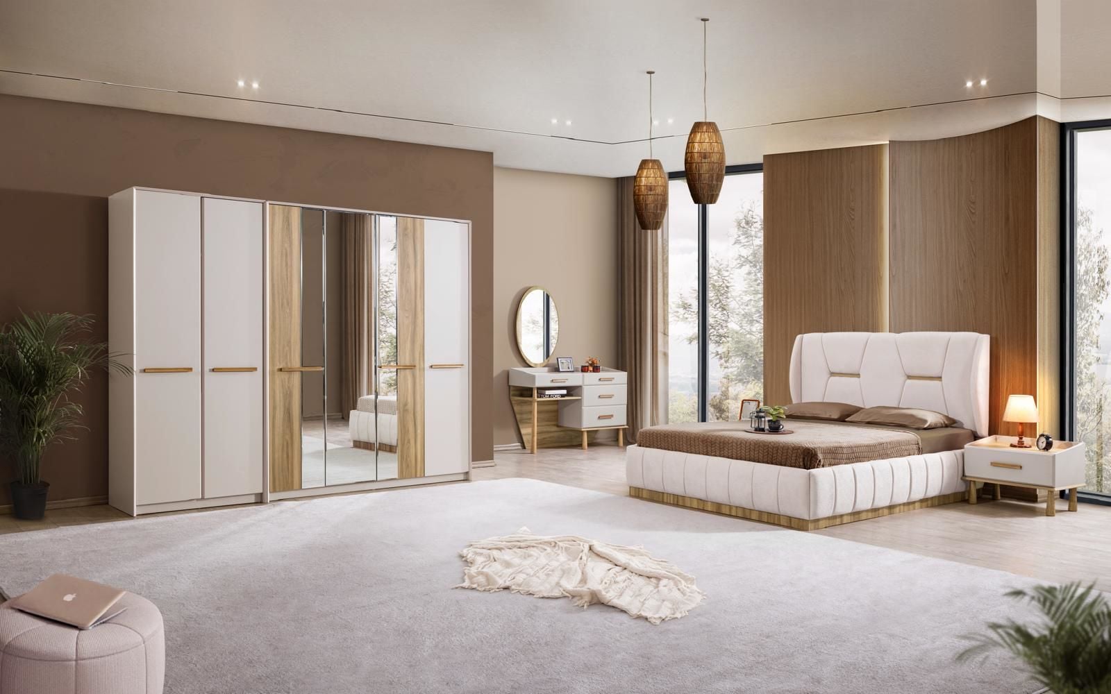 - Moon Yatak Odası Takımı, 6 Kapılı Dolap, Şifonyer, Bazasız karyola başlık ve 2 adet Komodin'den oluşmaktadır.