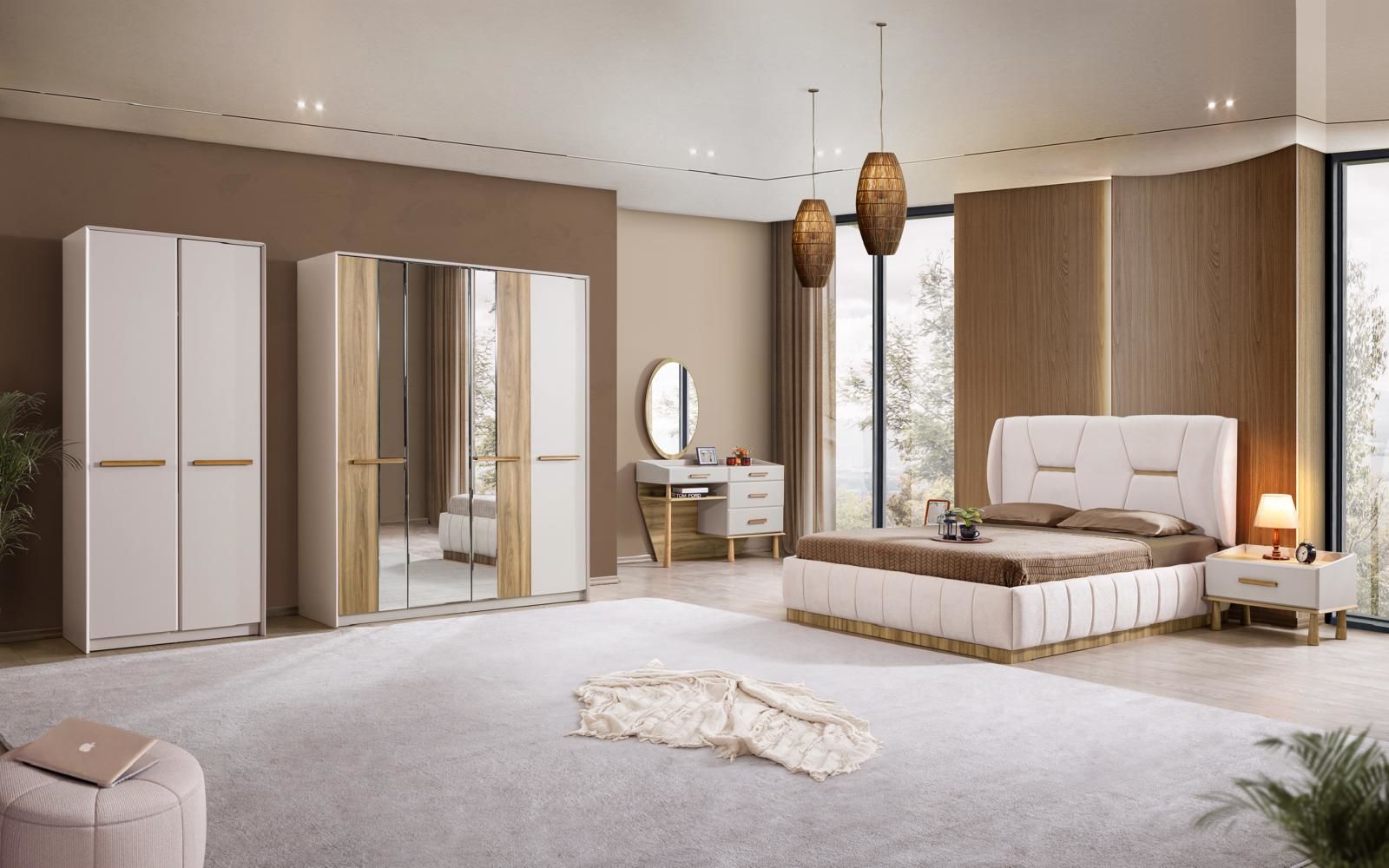 - Moon Yatak Odası Takımı, 6 Kapılı Dolap, Şifonyer, Bazasız karyola başlık ve 2 adet Komodin'den oluşmaktadır.