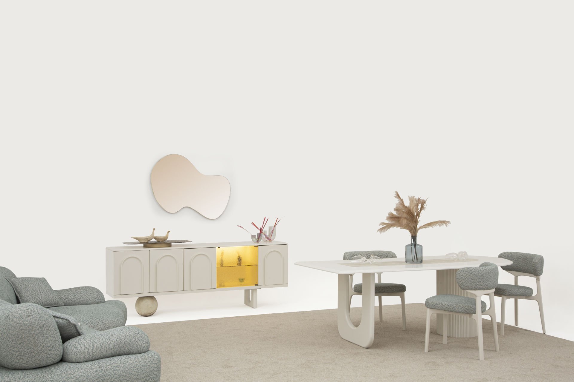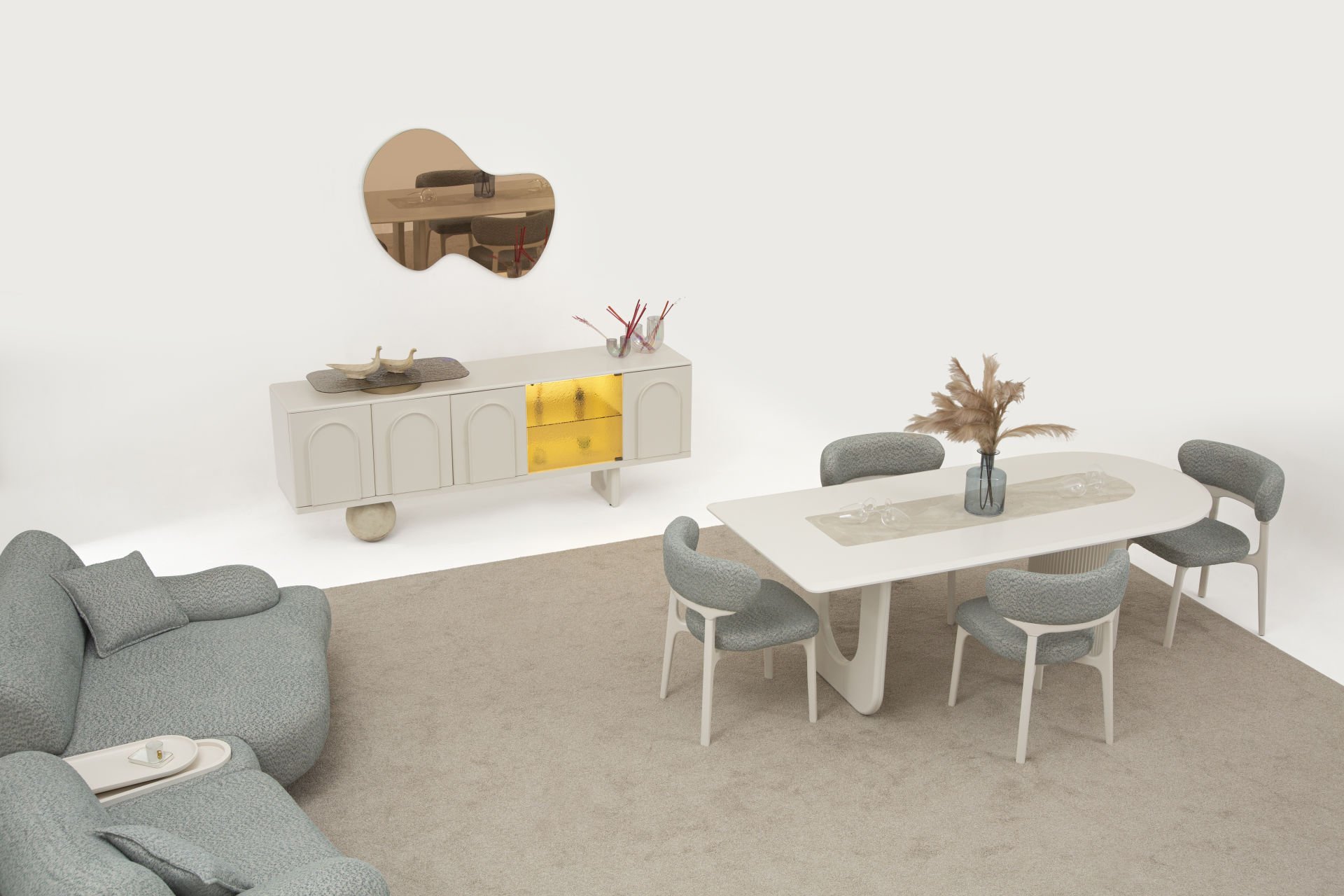 - Oslo yemek odası içeriği : 1 Adet Konsol+aynası, 1 Adet Masa, 6 Adet Sandalye den oluşmaktadır.(Görselde görülen sandalyeler)