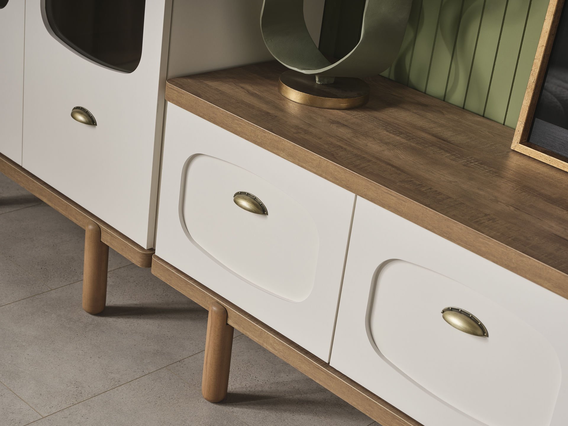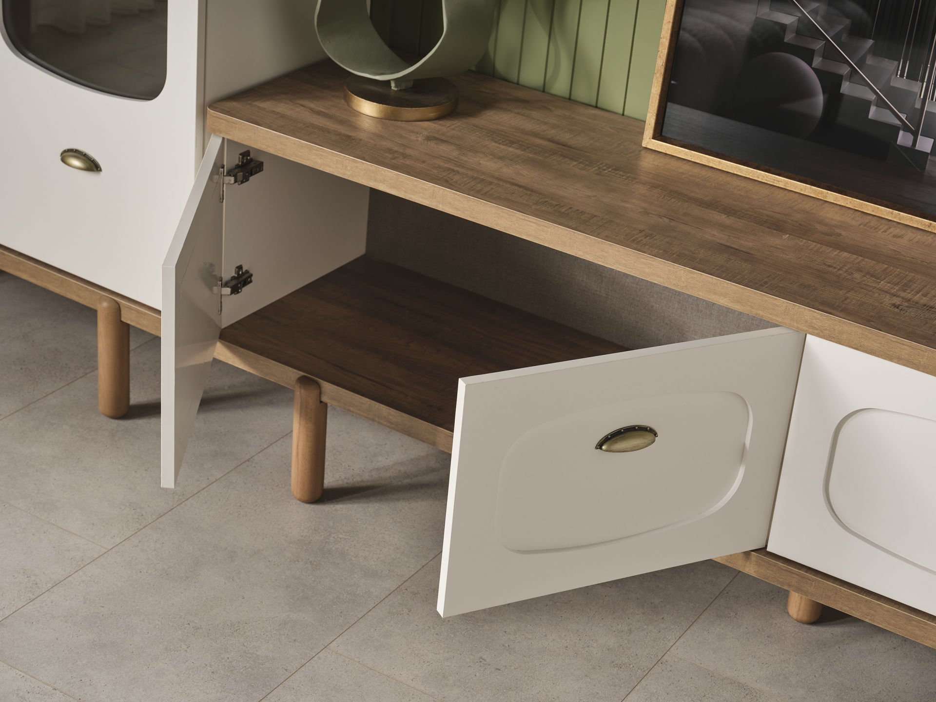 - Rigel Tv Ünitesi, alt modül, cam kapaklı vitrin ve ahşap kapaklı vitrin den oluşmaktadır.