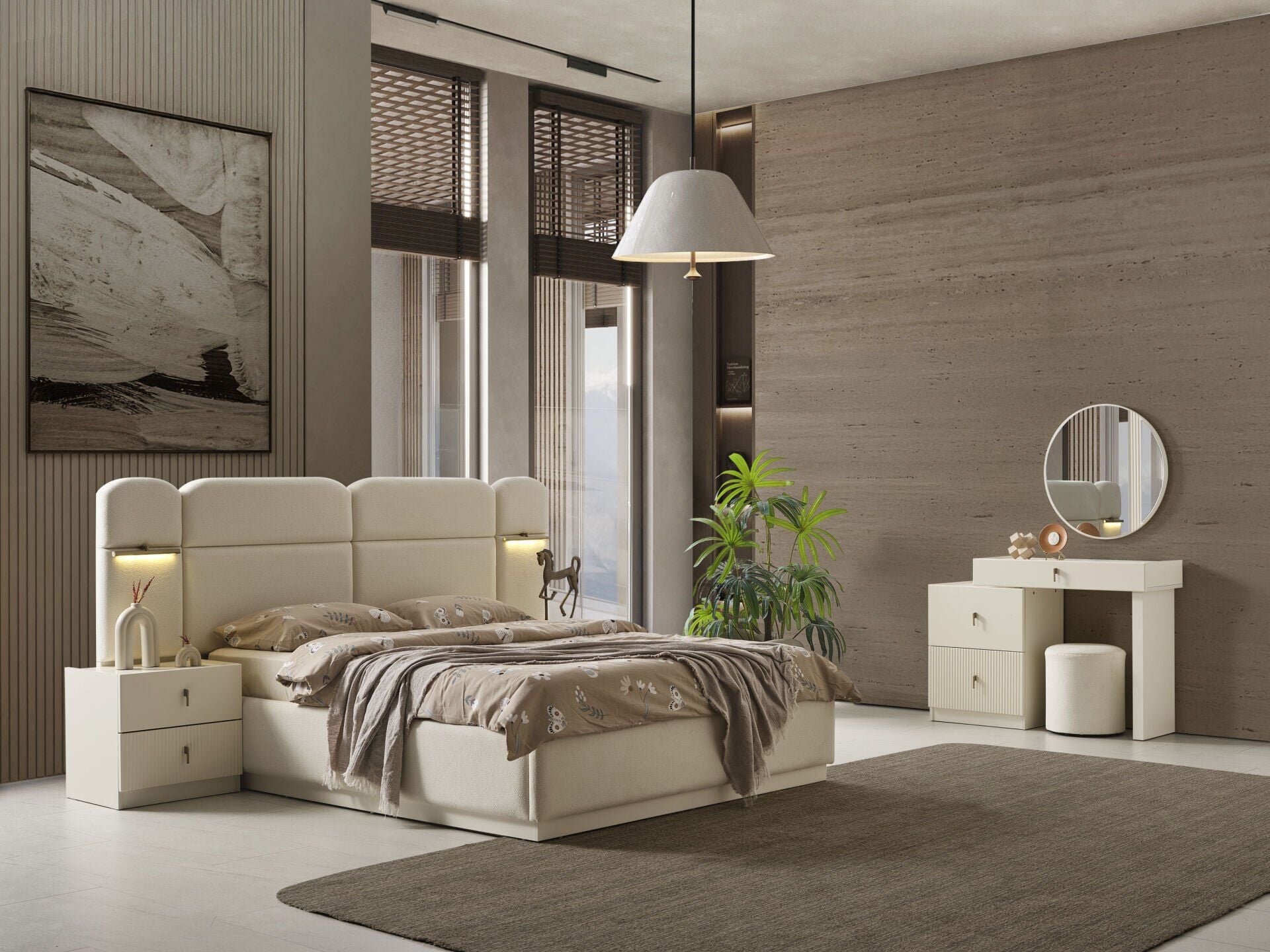 - Roza Köşe Dolaplı Yatak Odası, 1 adet 4 kapılı dolap, 1 adet 2 kapılı dolap, 1 adet tek kapılı dolap ve 1 adet köşe modülden oluşan 8 kapılı dolap; 2 adet komodin, 1 adet bazasız karyola, başlık, 1 adet Şifonyer ve aynasından oluşmaktadır.