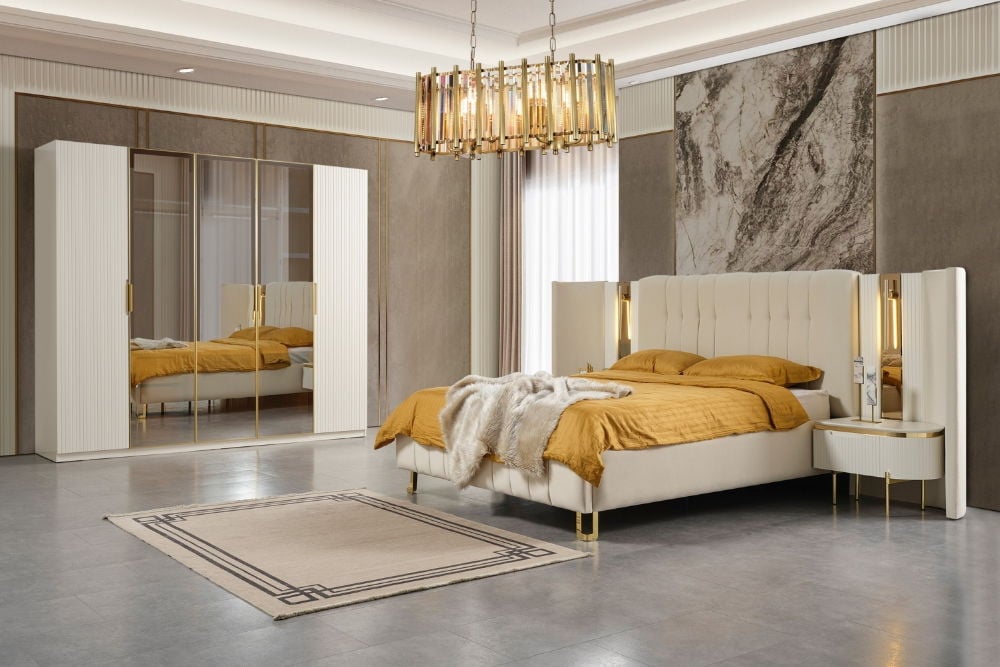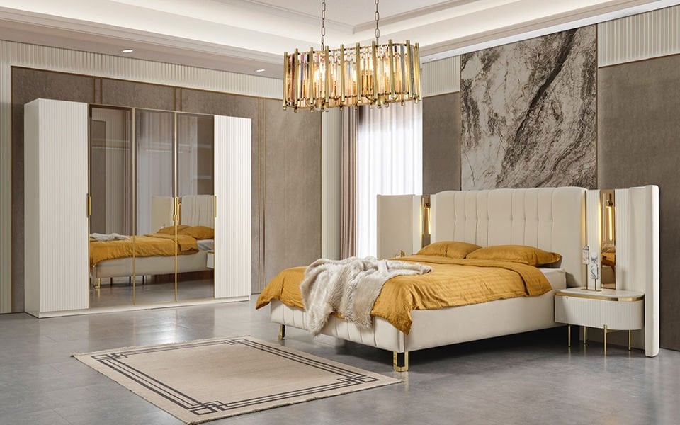 - Tesla Plus Yatak Odası Takımı, 5 Kapılı Gardolap, Şifonyer, Bazalı Karyola ve 2 adet Komodin'den oluşmaktadır.
