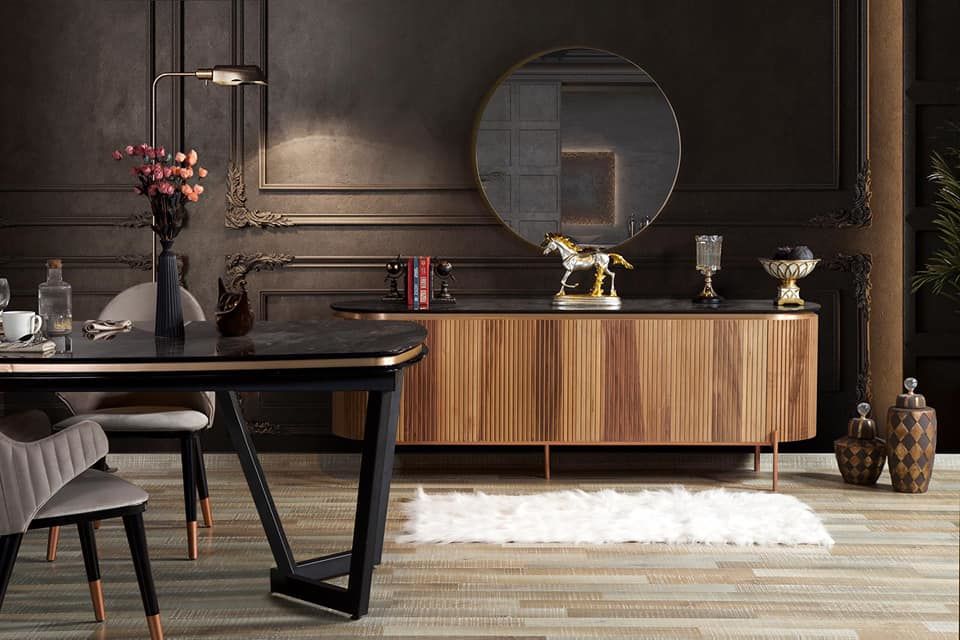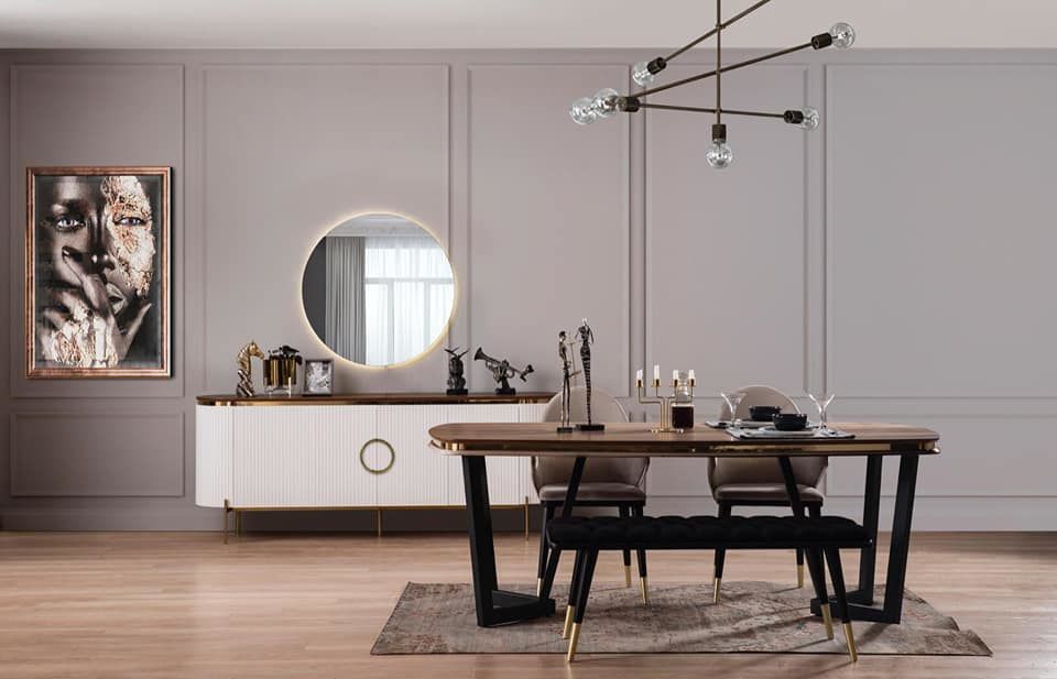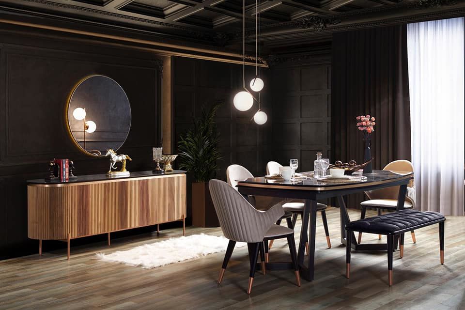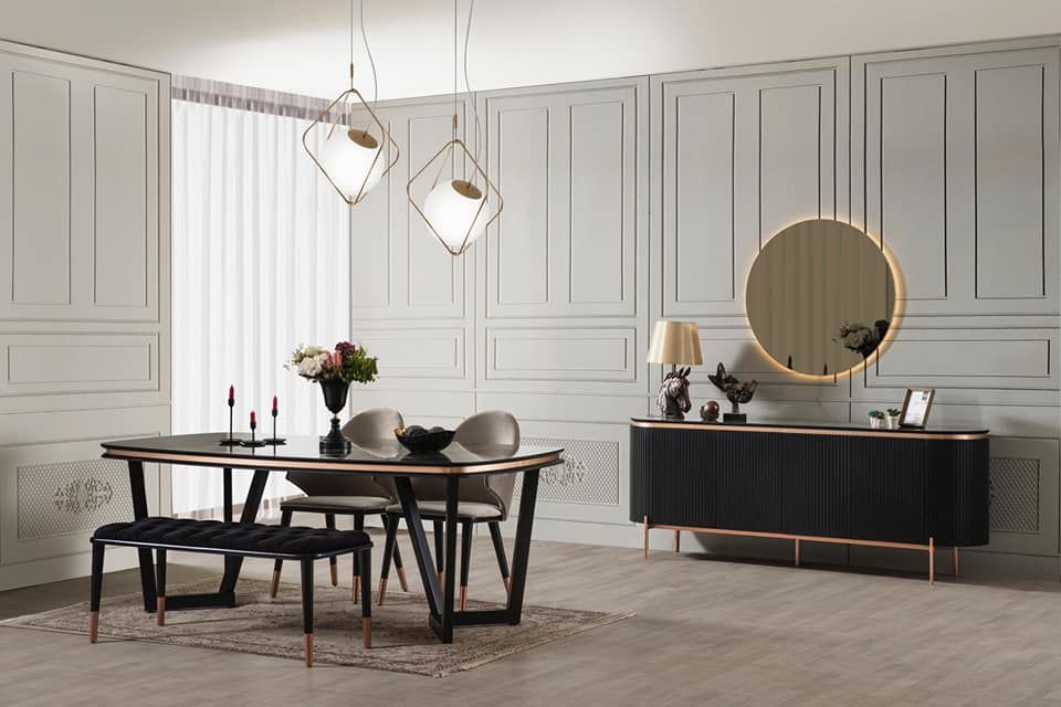 - Tesla yemek odası konsol + ayna , sabit masa ve 4 adet sandalye 1 adet bençten oluşmaktadır.