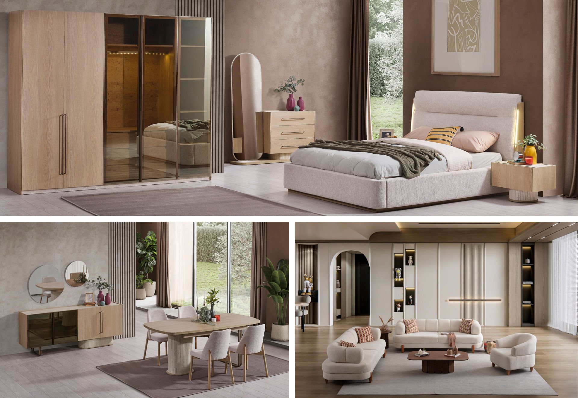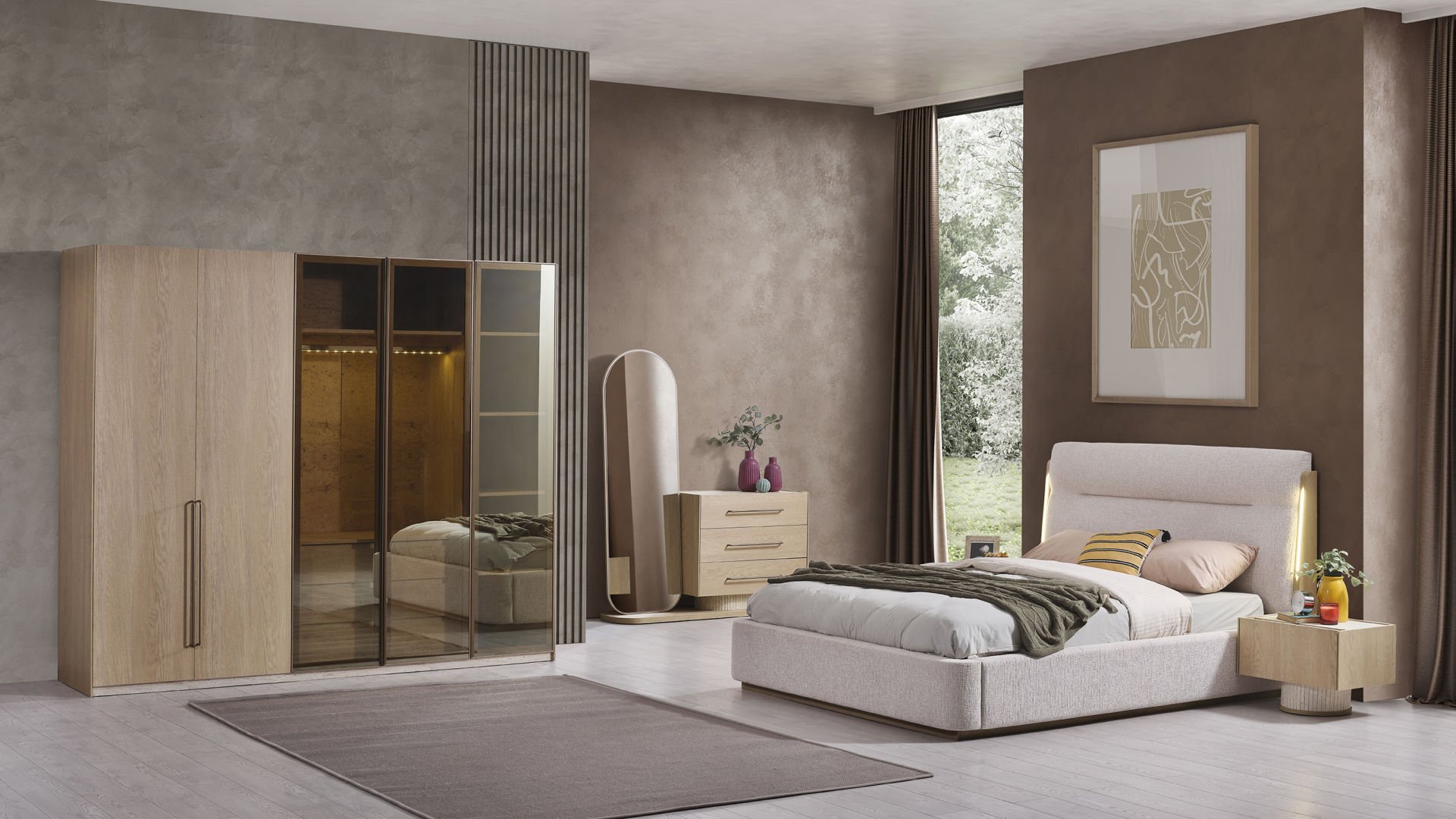 - Tual Yatak Odası Takımı; Gardolap, Şifonyer + ayna, Bazalı karyola ve 2 adet Komodin'den oluşmaktadır.