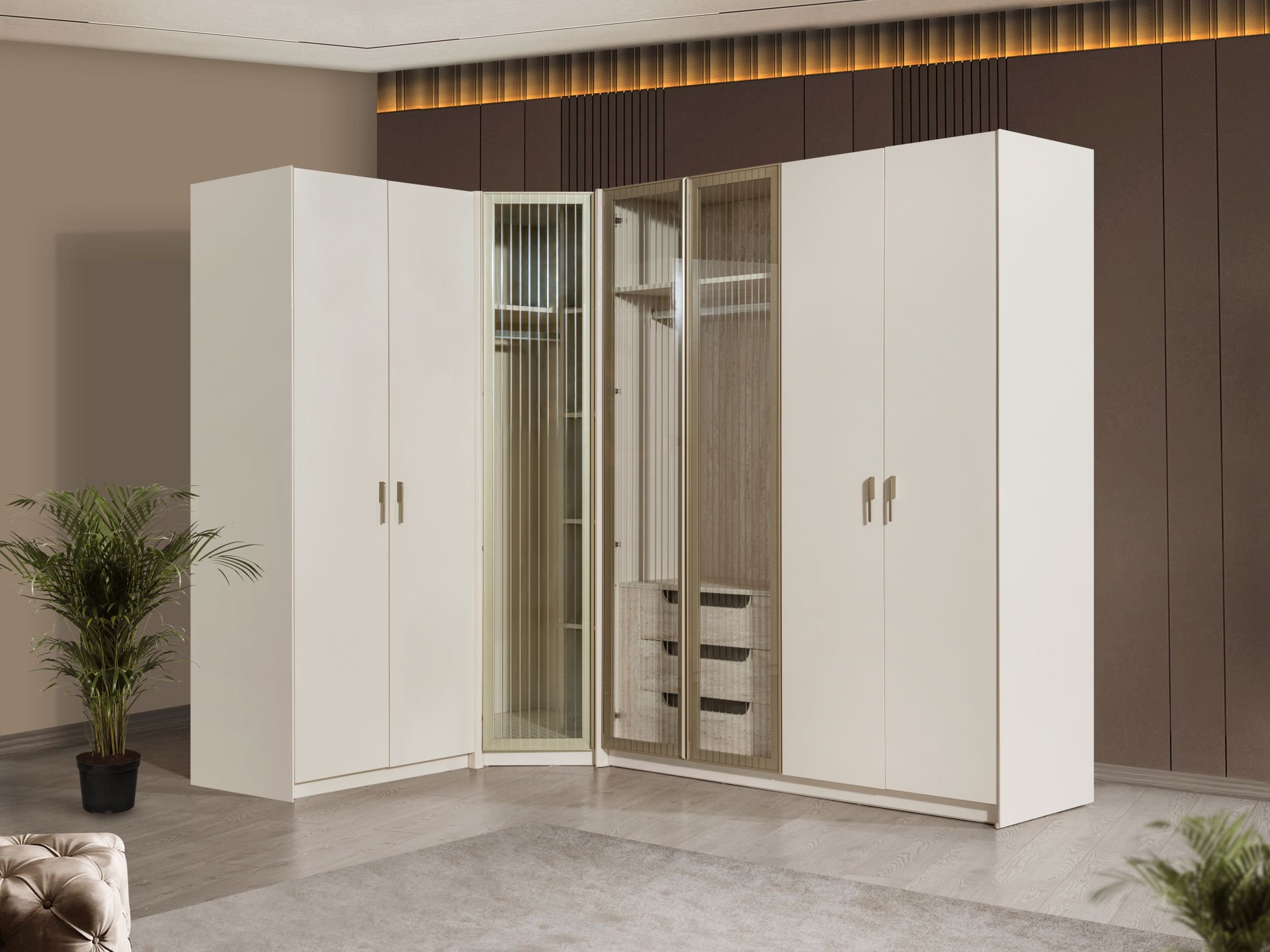 - Köşe dolap seceneği mevcut olup modüler parçalara sahiptir. İsteğe bağlı kapak sayısı düşürülebilir. 1,2,3,4 kapılı gibi yine isteğe bağlı kapak sayısı eklenebilir. 6,7,8,9.... gibi